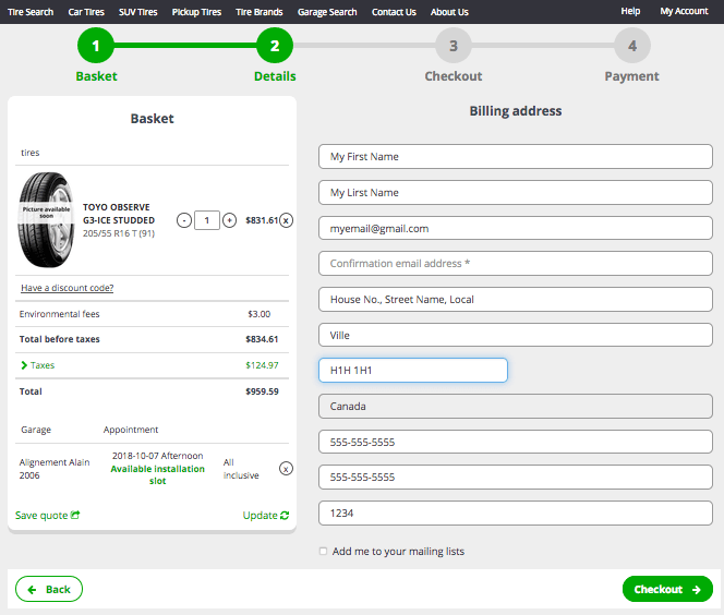 Leading partnered installers nationwide – We work with a network of more than 1000 professional mechanical shops across Canada. The garages we carefully selected are located throughout Canada and they offer quick and convenient installation, suitable to your needs and availabilities. We ship tires to the selected garage and we take care of all the arrangements. All you need to do is to get to your appointment and have your tires installed. You will pay at the garage directly for the services required.