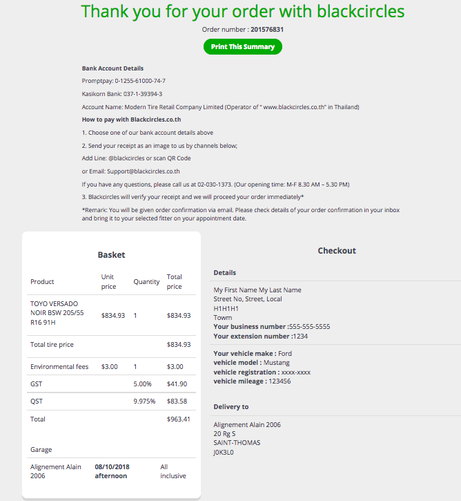 STEP 4: As illustrated in below, you can review your order summary e.g. the selected tires, the quantity, the prices, the garage and the appoointment date.