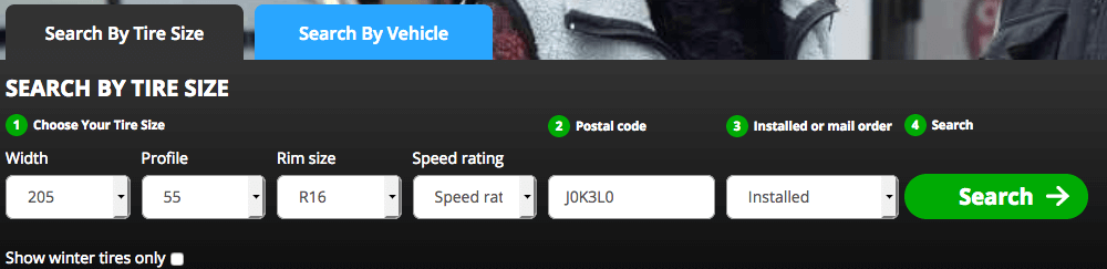STEP 1: When purchasing tires from blackcircles.ca, you need to know your tire size. If you have this information you can enter it directly into our tire search tool. If you don't have the information, you can search for the size installed on your vehicle using our vehicle search tool.