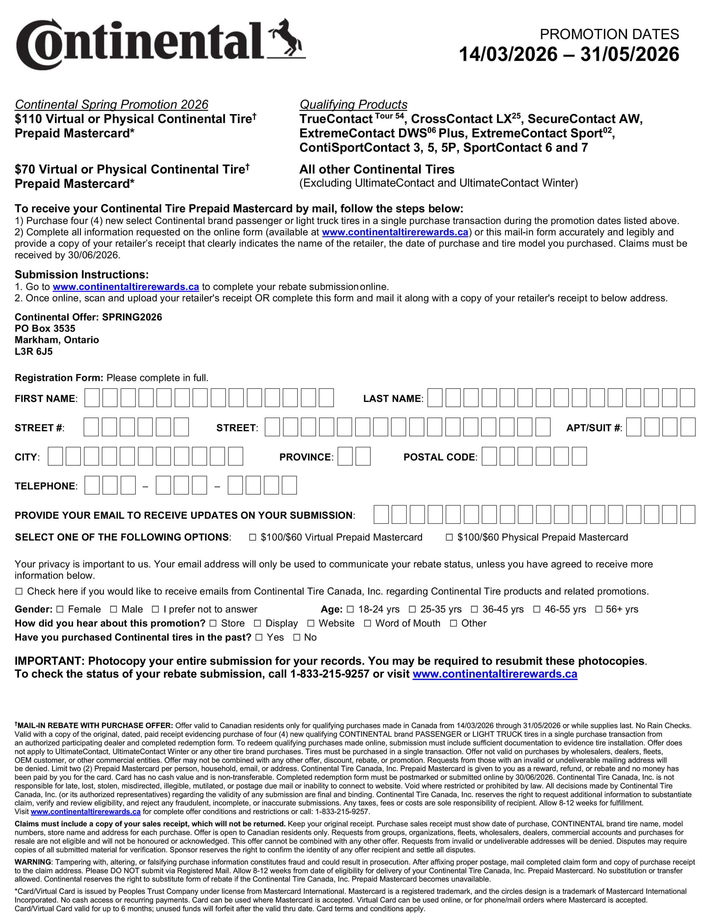 This offer applies to specific models of Continental tires, available for purchase at Blackcircles.ca. You can claim this rebate after purchase, but please note that all rebate claims must be submitted directly to Continental, the manufacturer, and not through Blackcircles.ca.
