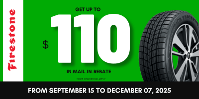 Take advantage of this unique opportunity and receive up to $110 in the form of a Firestone Mastercard prepaid card when purchasing a set of four (4) eligible Firestone tires.