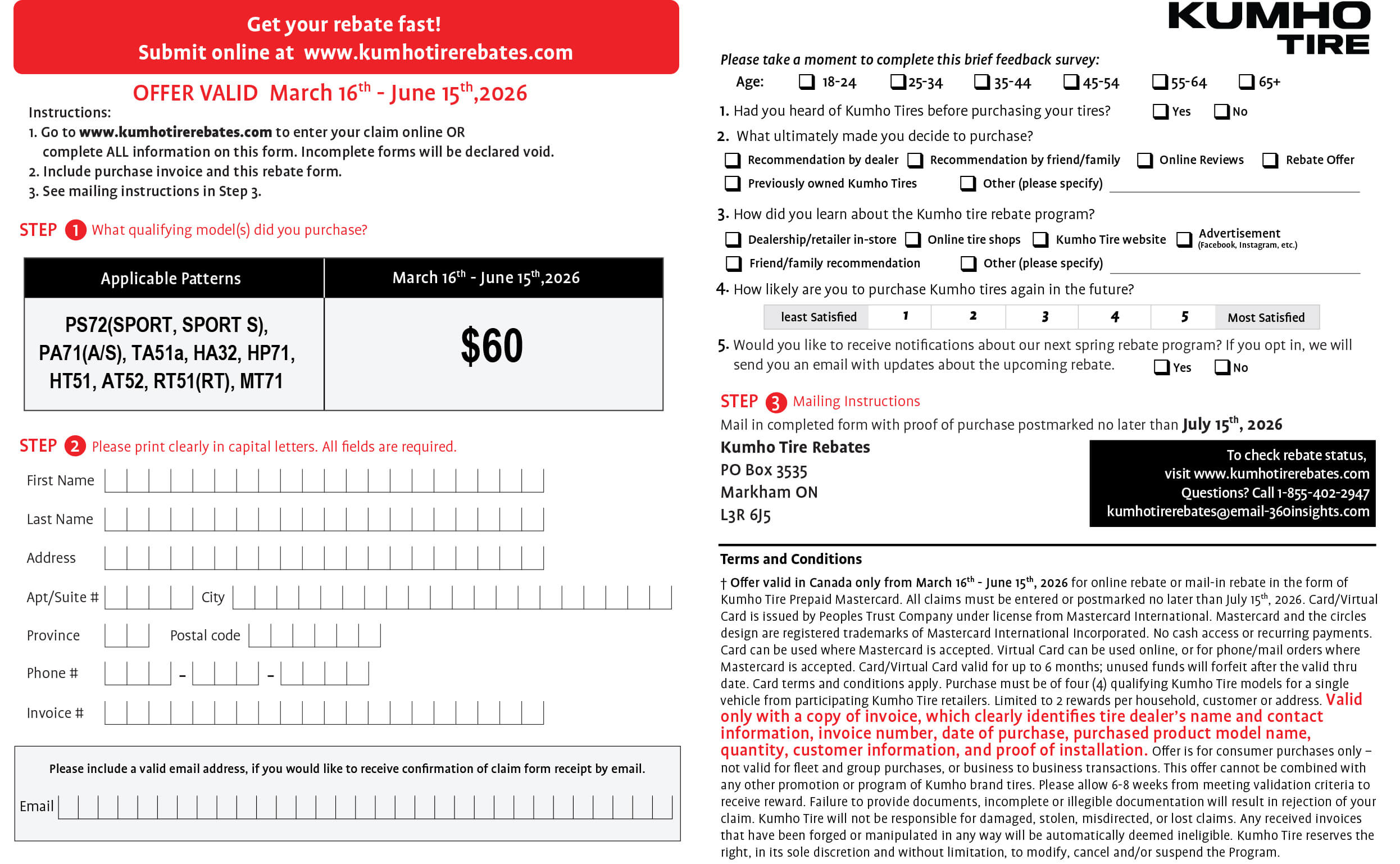 Once your purchase is completed, you can submit your rebate claim online through the official Kumho website or by mail by filling out the provided form.