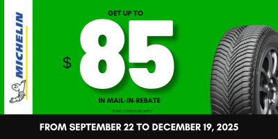 Take advantage of an exceptional offer and get up to $85 off on the purchase of new Michelin tires. This offer applies to the entire range of Michelin tires for passenger cars or light trucks.