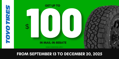 Don't miss this unique opportunity to save up to $100 on the purchase of eligible Toyo tires.