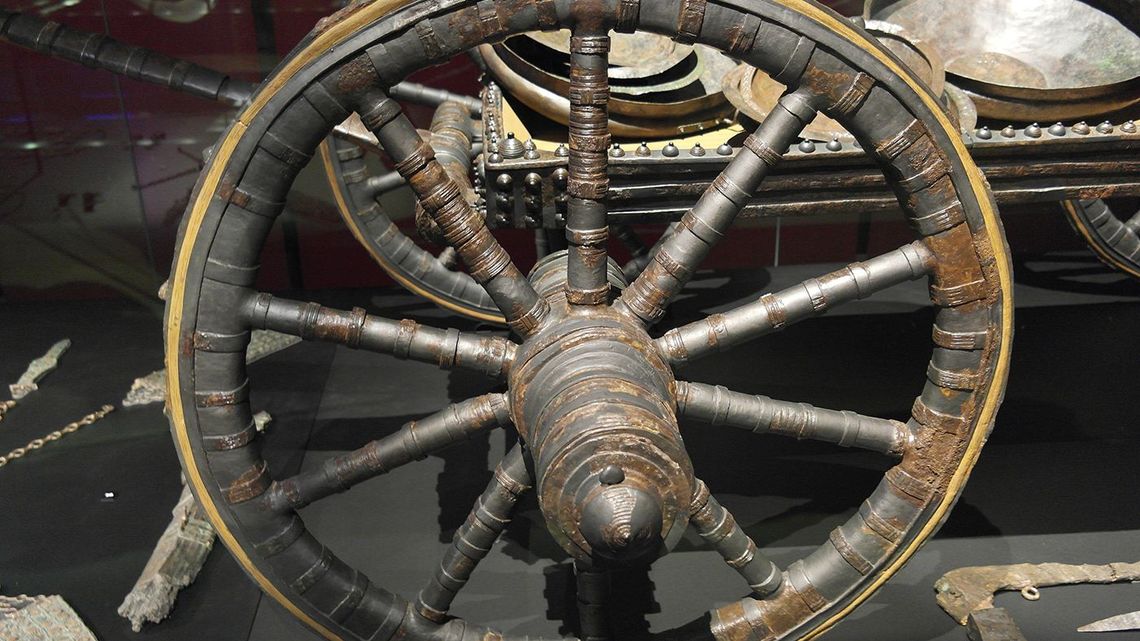 The earliest known wheels, dating back to prehistory, were made of solid wood. By antiquity, however, they had evolved into more familiar forms, with spokes and a rim made from several pieces. To make them more durable, wheelmakers fitted an iron band around the outside. This band was heated to expand it, placed around the wooden wheel, and then left to cool. As it contracted, it held the whole structure tightly together. That was the original tire.
