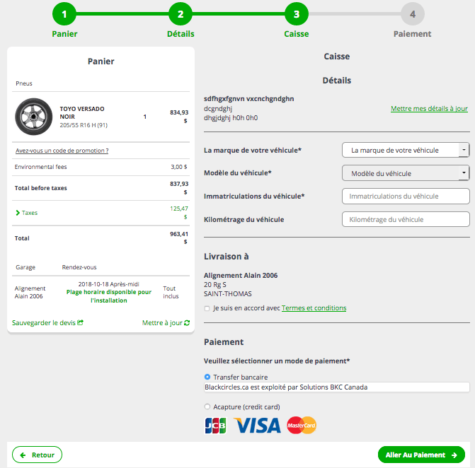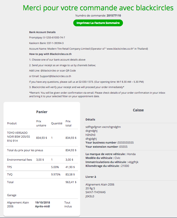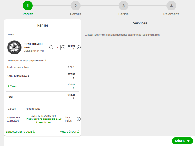 ÉTAPE 4 : Tel qu’illustré illustré à la figure 4 ci-dessous, vous pouvez consulter le récapitulatif de votre commande. Par exemple, le choix de vos pneus, la quantité de pneus, le prix des pneus, le centre de mécanique sélectionné et votre date de rendez-vous.