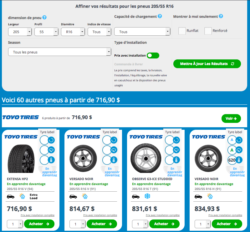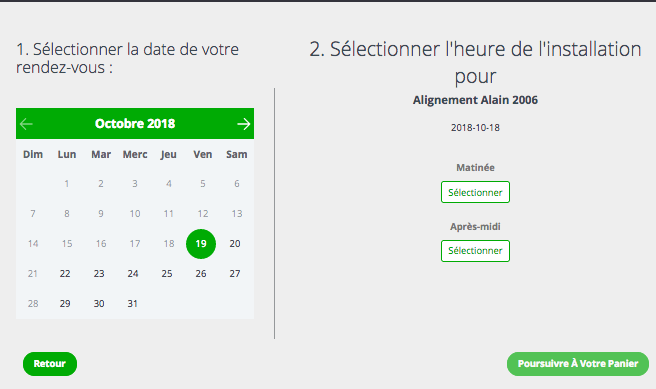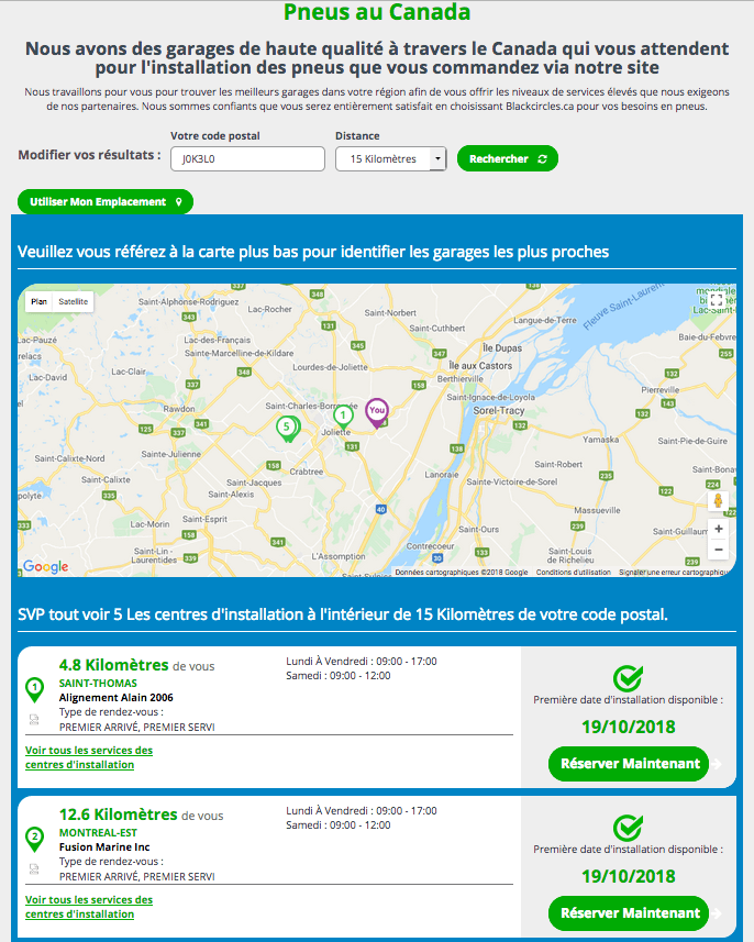 Si vous avez déjà sélectionné vos pneus, vous pourrez également voir la prochaine date d’installation disponible pour chaque centre de mécanique.