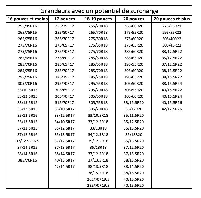 Les commandes contenant des pneus surdimensionnés ou en poids hors normes peuvent entraîner des frais supplémentaires. Si tel est le cas, notre équipe vous contactera afin de vous en informer, avant d'expédier vos produits. Vous aurez le choix d'accepter ces frais ou pourrez annuler votre commande sans frais.