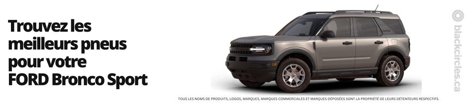 Chez Blackcircles.ca, nous proposons une large sélection de pneus adaptés à chaque version du Ford Bronco Sport, garantissant sécurité et performance tout au long de l'année. Que vous recherchiez des pneus d'été, d'hiver ou toutes saisons, nous avons ce qu'il vous faut.