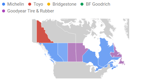 Pour les pneus Bridgestone, on peut observer une tendance hivernale similaire. Au top du classement des termes associés, ce sont les modèles Blizzak qui l’emportent haut la main, bien qu’on puisse aussi mentionner les populaires Ecopia. Géographiquement, c’est dans les Prairies que la compagnie rencontre le plus de succès, principalement en Alberta. Il semble en effet que leurs produits soient parfaitement adaptés à la vie rurale du grand grenier canadien!