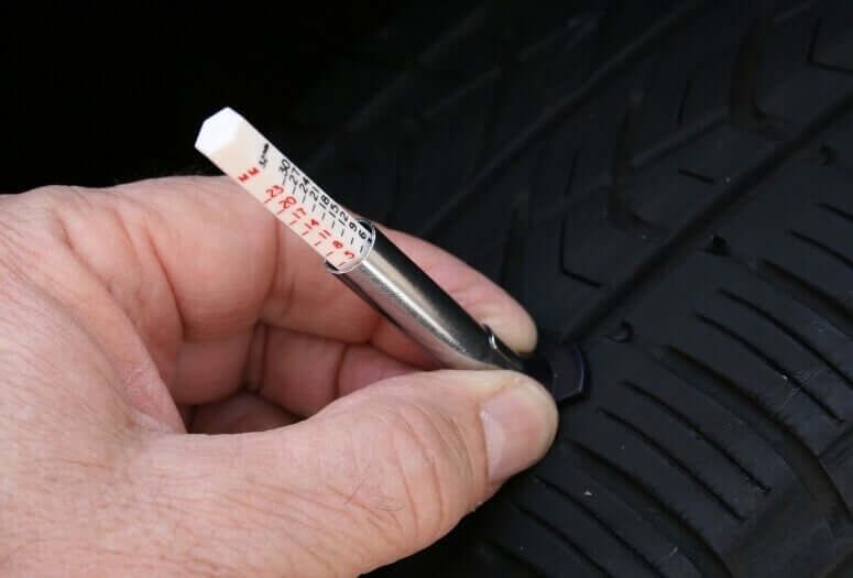 Lors d’une mesure à l’aide d’une jauge de profondeur, assurez-vous simplement que votre véhicule est bien garé, puis prenez la jauge et insérez-la dans une rainure (entaille) de votre pneu. Lorsque la tête de la jauge en touche l'intérieur, vous pouvez alors lire la mesure (tout comme un manomètre) et voir la profondeur de la bande de roulement en mm (millimètres). Toute profondeur de sculpture supérieure à 6 mm signifie que vos pneus sont sécuritaires et que vous pouvez continuer à les utiliser.