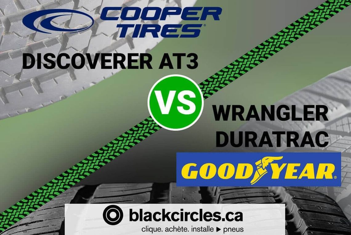 Blackcircles Canada vous vient en aide en vous proposant ce comparatif Goodyear Duratrac vs Cooper AT3. Chez blackcircles, profitez des meilleurs prix sur le marché, y compris sur les marques de pneus haut de gamme. Consultez également notre guide d’achat de pneus d’hiver pour vous orienter dans votre choix !
