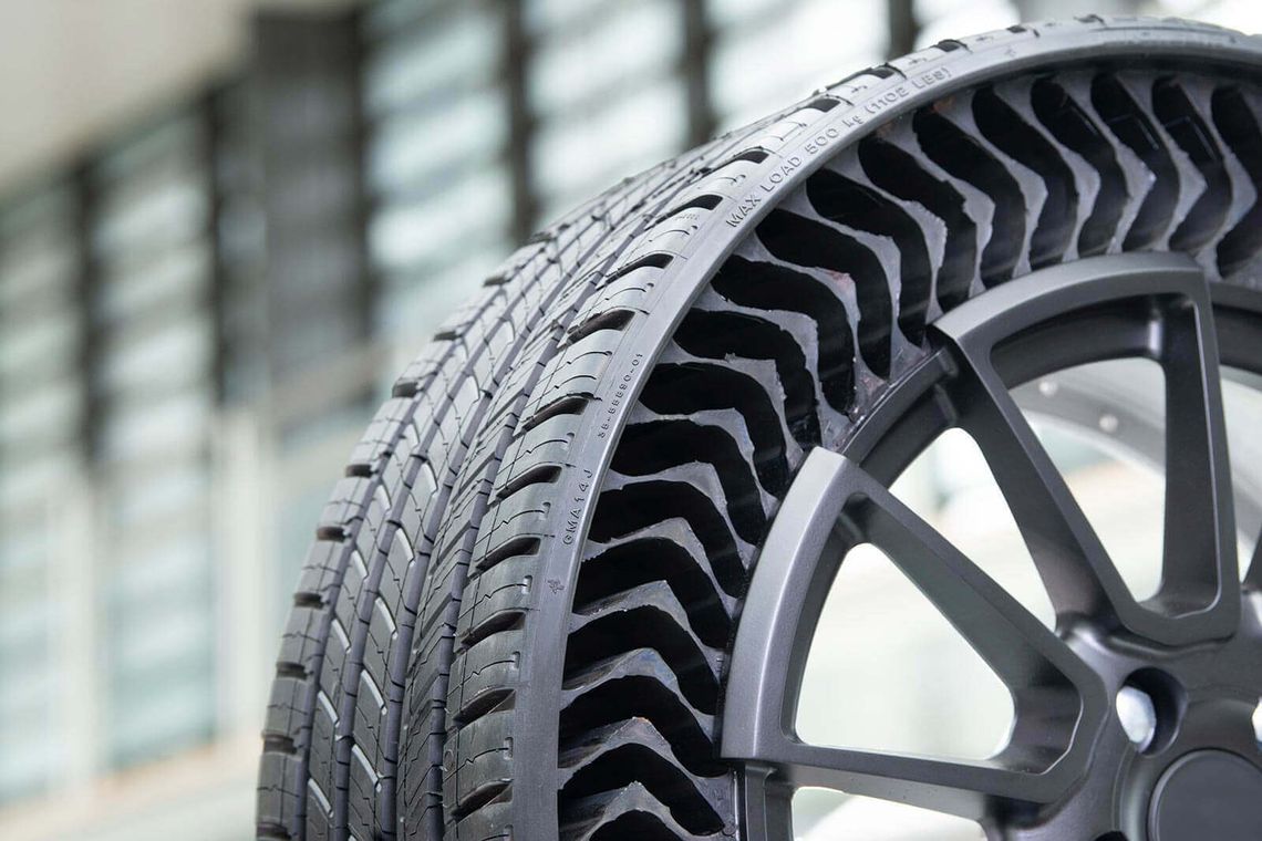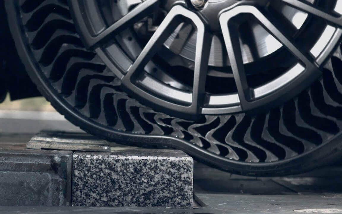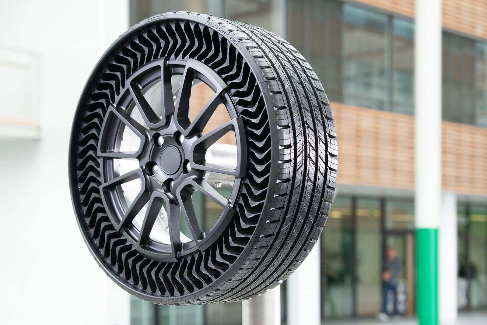 Comportant des matériaux composites développés à l’aide d’une nouvelle technologie, ces pneus offriront des performances comparables à celles des pneus actuels, à la différence près qu’ils seront à l’abri des crevaisons. Ces pneus sans air Michelin, composés d’un ensemble roue/pneu, ont pour autre avantage qu’ils ne pourront jamais être sous-gonflés!