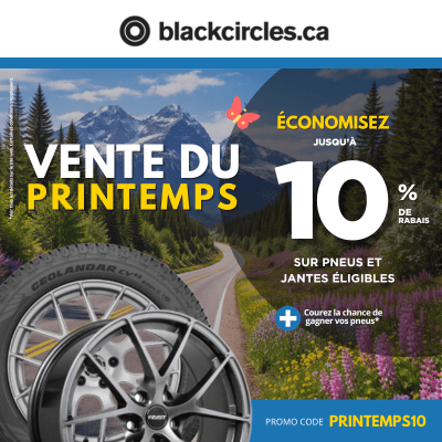 *Nos codes promotionnels ne peuvent pas être combinés entre eux ni avec d’autres offres ou promotions en cours. Nos offres sont disponibles pour une durée limitée et s’appliquent uniquement aux nouveaux achats. Pour en profiter, vous devez acheter au moins 4 pneus et/ou roues parmi les modèles et marques éligibles, sauf exception. La réduction s’applique automatiquement dans votre panier, à condition que le montant minimum requis avant taxes soit atteint. Veuillez noter que les frais supplémentaires, d’expédition et environnementaux ne sont pas inclus dans l’offre. Les produits Value Choice et Quality Choice Blackcircles ne sont pas admissibles à cette promotion. Les frais de livraison ne sont pas couverts par l’offre. Certaines conditions s’appliquent à notre Garantie de protection de prix, et des frais de retour et de manutention peuvent être exigés en cas de retour ou d’échange. Nous nous réservons le droit de modifier ou d’interrompre cette promotion sans préavis.
