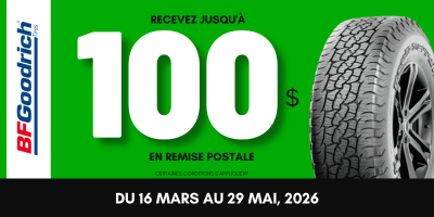 Profitez de cette offre spéciale de BFGoodrich et recevez jusqu'à 100 $ de rabais pour l'achat de 4 pneus neufs. Cette promotion est applicable sur certains modèles de pneus pour voitures de tourisme et camions légers.