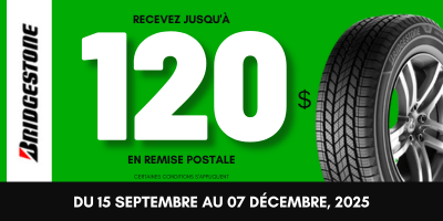 120 $ : Blizzak, WeatherPeak™ (pour un prix d'achat de 1000 $ ou plus - avant taxes et autres frais)