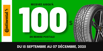 Profitez d'une offre exceptionnelle et obtenez jusqu'à 100 $ de rabais sur l'achat de pneus neufs Continental. Cette offre s'applique sur toute la gamme de pneus Continental pour voitures de tourisme ou camions légers.
