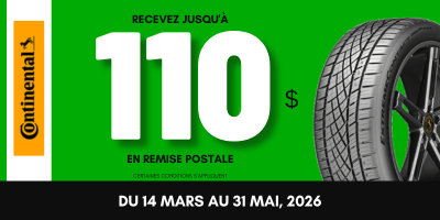 Profitez d'une offre exceptionnelle et obtenez jusqu'à 110 $ de rabais sur l'achat de pneus neufs Continental. Cette offre s'applique sur toute la gamme de pneus Continental pour voitures de tourisme ou camions légers.