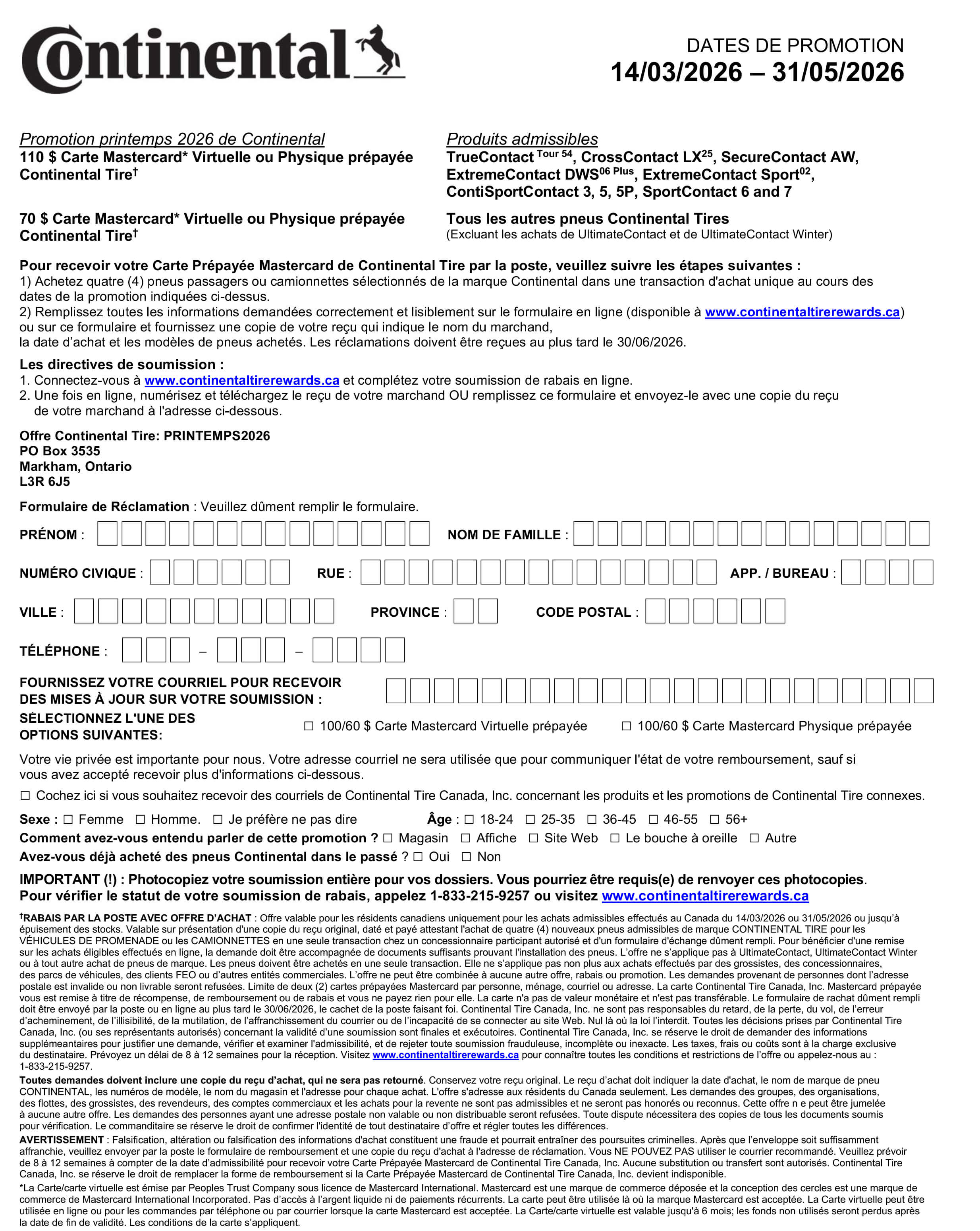 Cependant, si vous avez acheté vos pneus durant cette période, vous pouvez encore soumettre votre demande de remise postale après la date limite, conformément aux conditions définies par Continental.