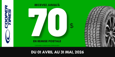 Profitez de cette offre exclusive et obtenez jusqu'à 70 $ de rabais sur l'achat de pneus Cooper Tires éligibles. Choisissez parmi une sélection de modèles de pneus.
