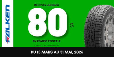 Ne manquez pas cette opportunité exceptionnelle d'économiser jusqu'à 80 $ lors de l'achat de 4 pneus Falken éligibles.