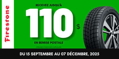 Magasinez la sélection de pneus Firestone qui bénéficient d'une remise postale et saisissez cette offre exclusive. Que vous optiez pour la livraison à domicile ou une installation chez nos partenaires locaux, nous vous offrons une expérience sans tracas. Ne laissez pas passer cette opportunité de rabais !