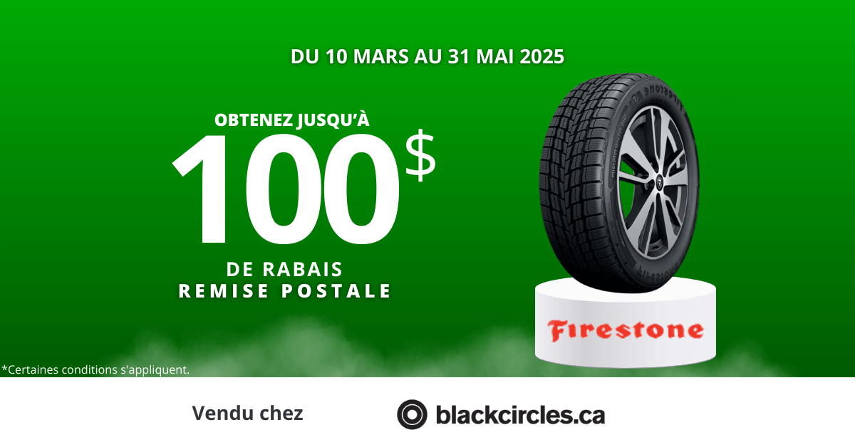 Cette offre est valable pour des modèles spécifiques de pneus Firestone, disponibles sur Blackcircles.ca. La remise est applicable après l'achat, mais il est important de noter que toutes les demandes doivent être soumises directement à Firestone, le fabricant, et non à Blackcircles.ca.