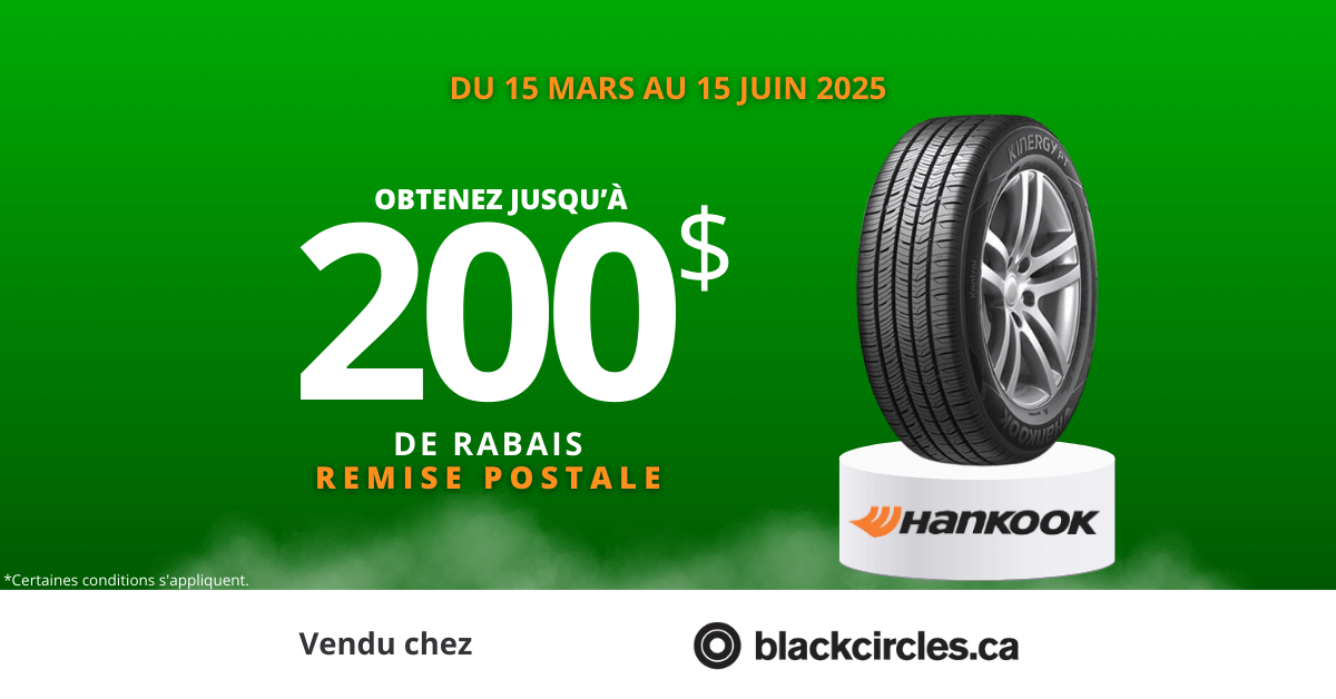 Cette offre est valable uniquement pour les modèles spécifiques de pneus Hankook, disponibles à l'achat chez Blackcircles.ca. La remise sera applicable après l'achat, sous réserve de soumettre votre demande directement auprès de Hankook, le fabricant, et non via Blackcircles.ca.
