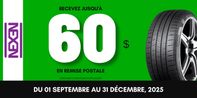 Profitez de cette offre en ligne exclusive pour obtenir jusqu'à 60 $ de rabais sur l'achat de pneus neufs Nexen éligibles.
