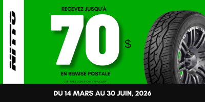 Profitez d'une offre exclusive en ligne et recevez jusqu'à 70 $ de remise postale sur l'achat d'un ensemble de 4 pneus neufs Nitto éligibles. Cette promotion s'applique à une sélection de modèles idéals pour préparer votre véhicule aux conditions hivernales ou pour améliorer votre confort de conduite toute l'année.