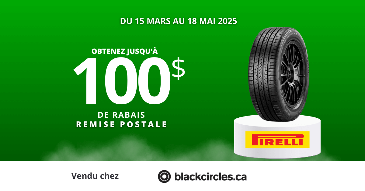 100 $ : Pour l'achat de Cinturato WeatherActive, Cinturato Winter WTC2, IceFriction, P Zero Winter, P Zero Winter 2, P Zero Winter D, Scorpion All Terrain Plus, Scorpion Ice & Snow, Scorpion WeatherActive, Scorpion Winter, Scorpion Winter 2, W.Sottozero S.II, Winter 210 Snow-Control Serie 3, Winter 210 Sottozero Serie II, Winter 240 Sottozero Serie II, Winter 270 Sottozero Serie II