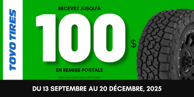 Ne manquez pas cette opportunité unique pour économiser jusqu'à 100 $ sur l'achat de pneus Toyo éligibles.
