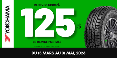 Profitez de cette offre exclusive et obtenez jusqu'à 125 $ de rabais sur l'achat de pneus Yokohama Tires éligibles. Choisissez parmi une sélection de modèles de pneus.