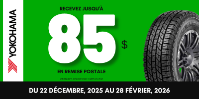 Découvrez les modèles de pneus Yokohama éligibles et bénéficiez d'une remise postale exclusive. Profitez également de la livraison à domicile ou optez pour une installation chez nos partenaires locaux pour une expérience sans souci. Ne manquez pas cette offre et magasinez notre sélection dès aujourd'hui !